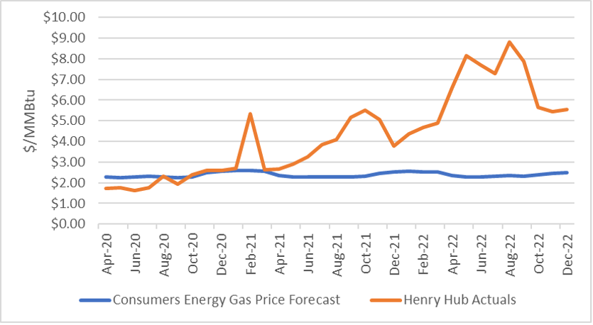 To justify their infrastructure spending, Consumers Energy relied on an assumption of low natural gas prices through 2040. However, history reminds us that gas prices can be as unpredictable as the weather, and Consumers Energy’s forecasts have been wrong before (fig. 7).