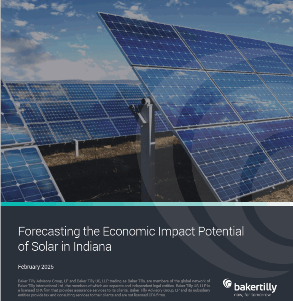 The Baker Tilly report, Forecasting the Economic Impact Potential of Solar in Indiana, looked at all of the solar projects planned and slated to begin operation in Indiana by 2027. The report examines the tax benefit, local economic development gains, and job creation prospects should all planned projects proceed.